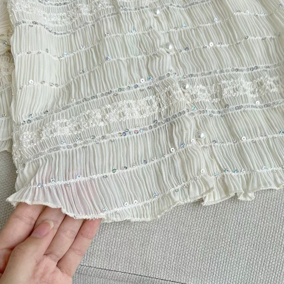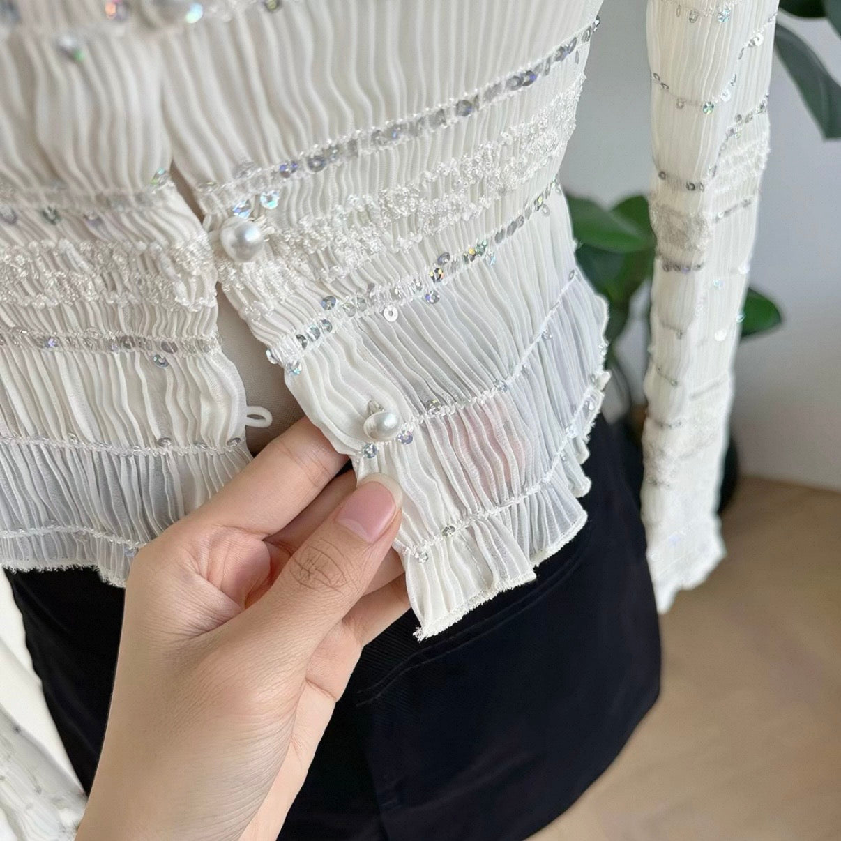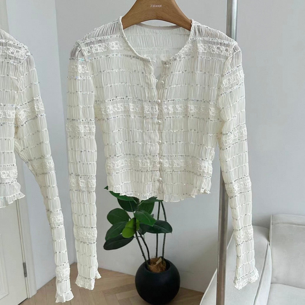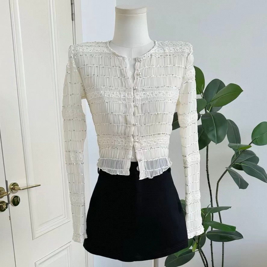 シャーリングパールクロップドトップス