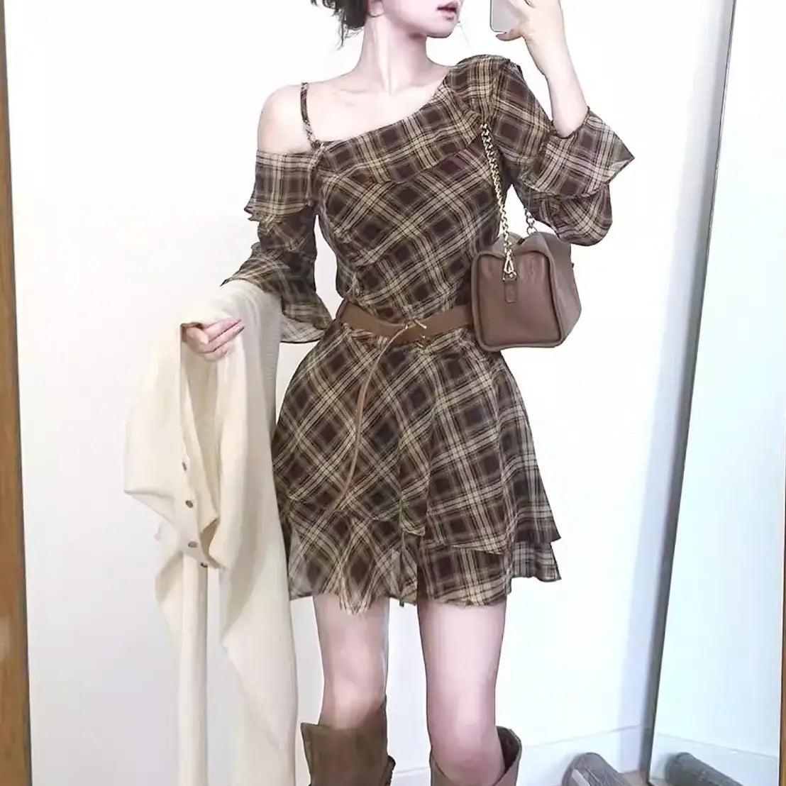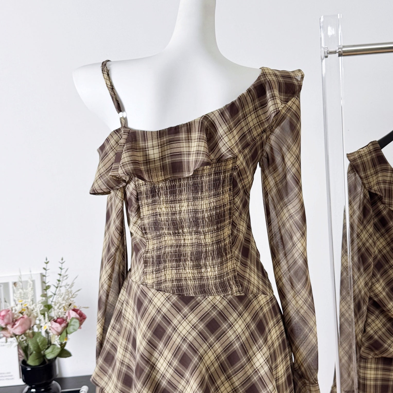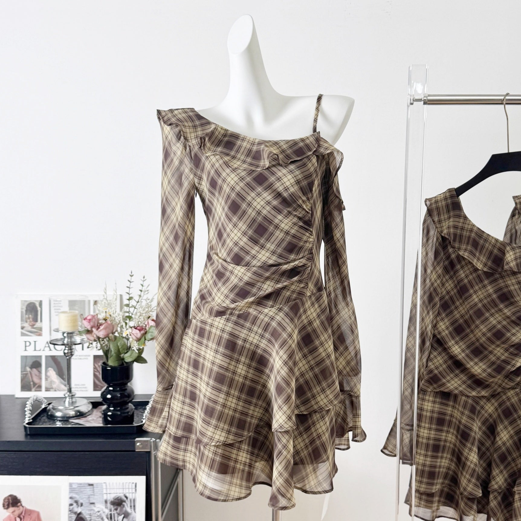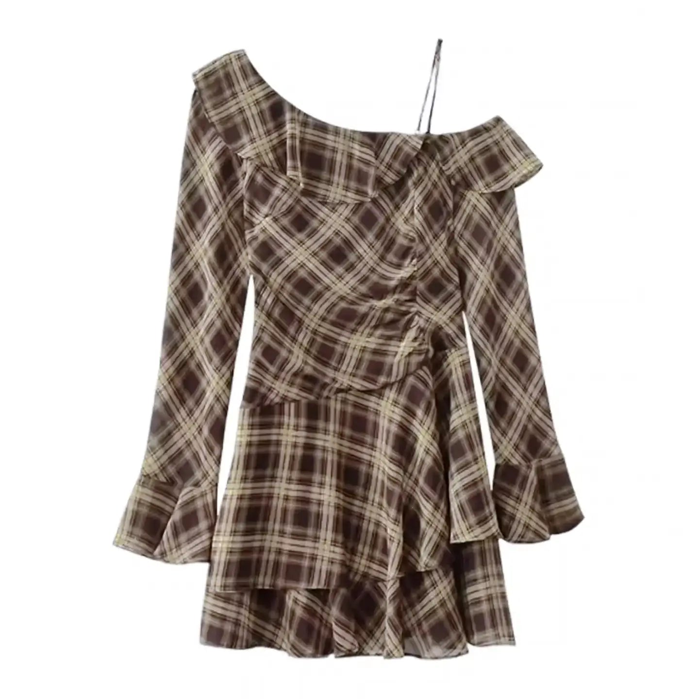 ワンショルダーチェックアシンメトリーワンピース