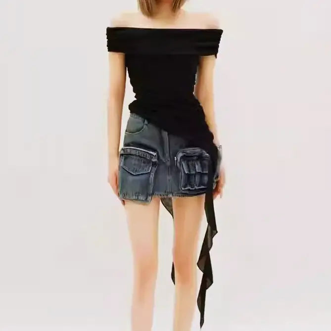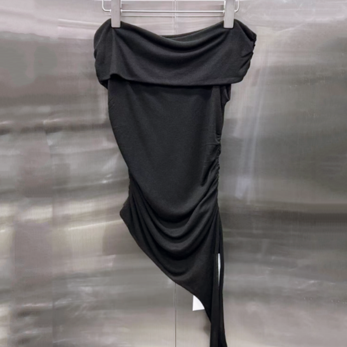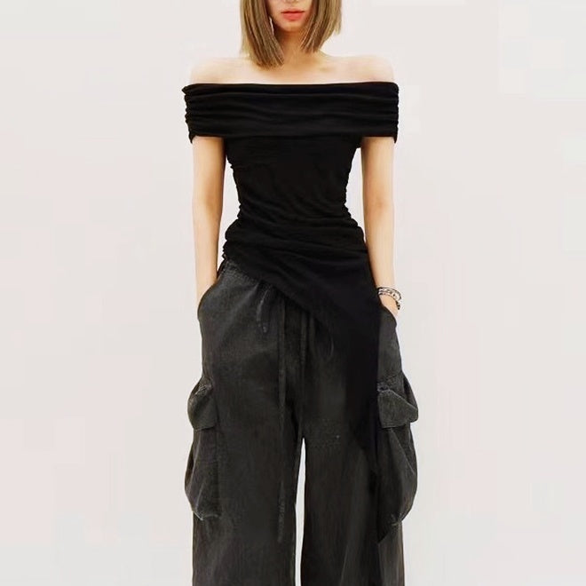 【即納】アシンメトリードレープオフショルトップス