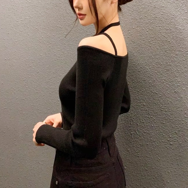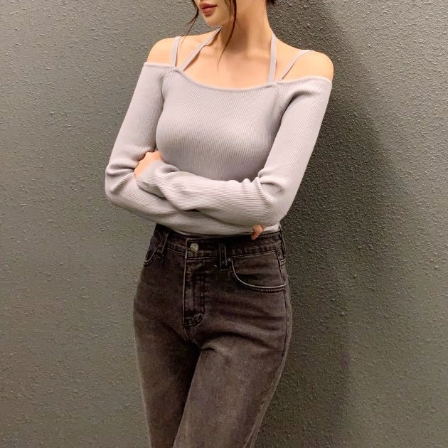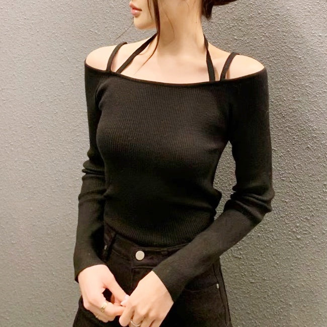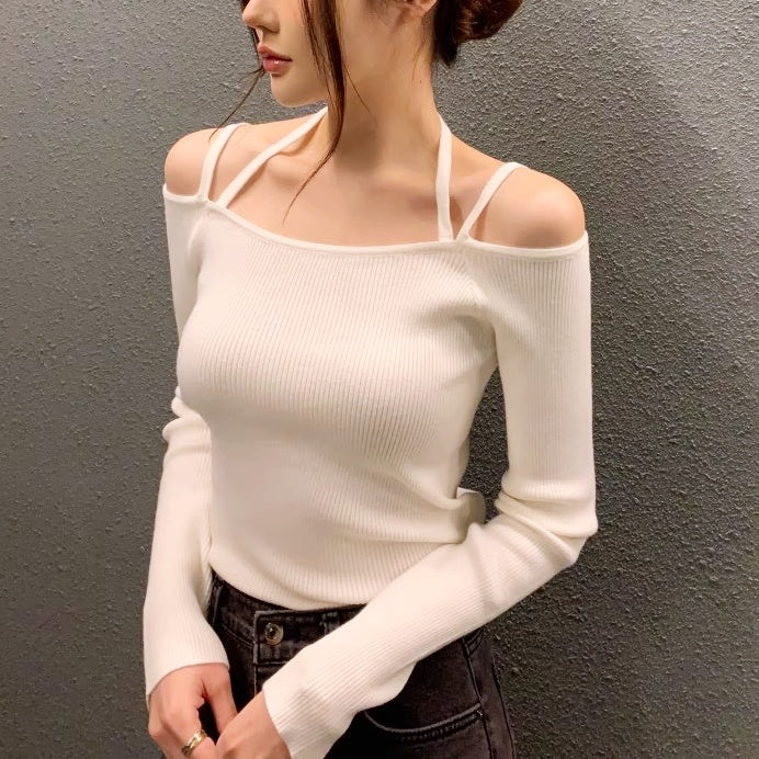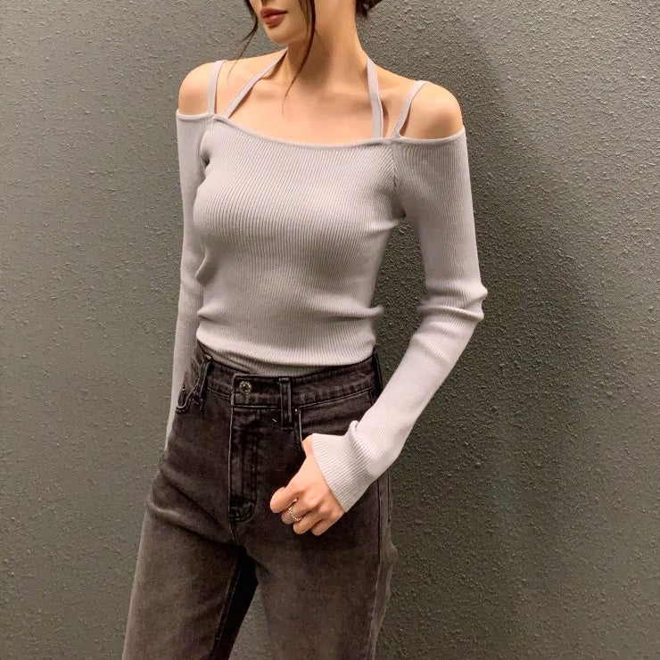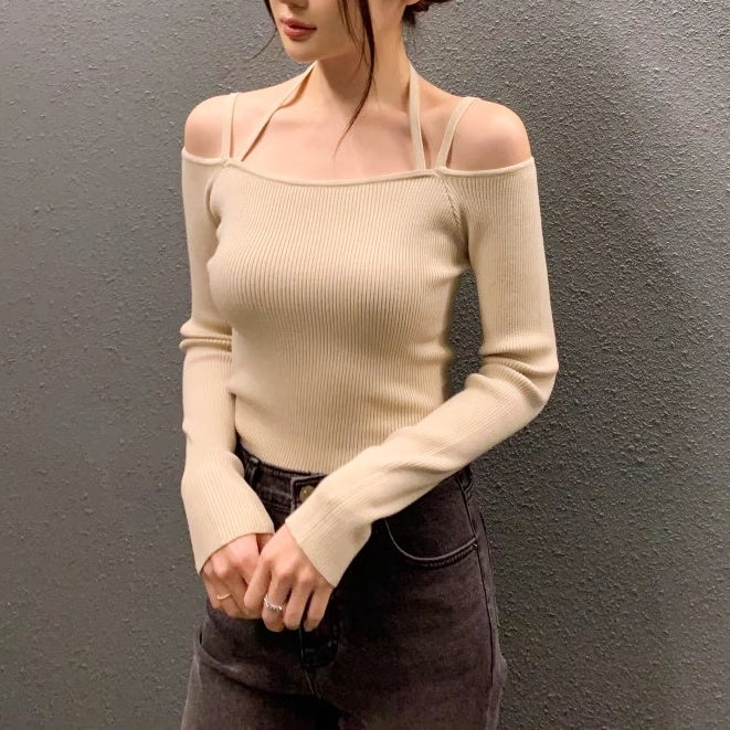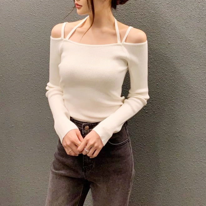 ショルダーストラップオフショルリブトップス